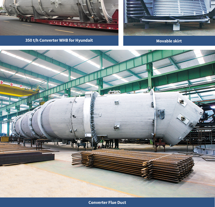 Converter flues within the range of 15ton to 300ton have been designed and manufactured since 1990. The pressures of flues are 0.8Mpa~4.0Mpa.The circulation is nature type for 80ton and below converter flues, nature + force circulation for converter flues above 80ton. Meet the needs of the domestic market (with a domestic market share of more than 80%)Meanwhile, products are exported to Korea, USA, etc.,