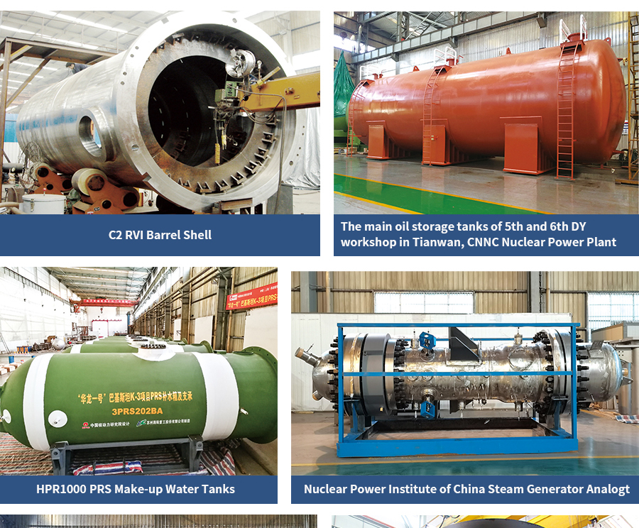As being the skeleton of reactor core, RVI is one of the key equipment of nuclear island. It has six core functions: housing fuel assembly and auxiliary assembly, providing positioning and preload, bearing the load from core components; providing reliable and accurate guidance for the control rod assembly; providing coolant channel for core and its appropriate flow distribution; shielding neutron and γ rays to reduce irradiation aging of pressure vessel; providing fixed support and guidance for core neutron flux measuring and temperature measuring, providing fixed position for pressure vessel irradiation surveillance specimen; providing the secondary support for crore fallen. HLHI is the first enterprise in China to manufacture the RVI barrel shells.The primary heat exchangers mainly include the regenerative heat exchanger, the lower heat exchanger, the excess lower heat exchanger, the waste heat exchanger, the boron return liquid evaporator, the de-hydro tower and exhaust condenser.The primary circuit box equipment includes boric acid preparation boxes, accumulators, pressure relief boxes, etc.