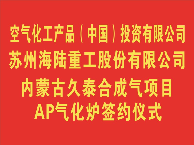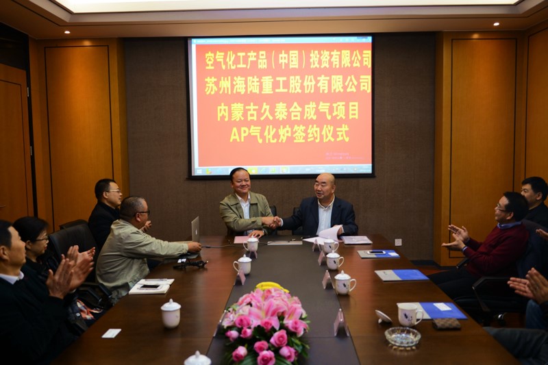 2018年12月6日下午,在海陸重工會議室,空氣化工產(chǎn)品(中國)投資有限公司與蘇州海陸重工股份有限公司,舉行久泰合成氣項(xiàng)目AP氣化爐簽約儀式,AP公司采購總監(jiān)戴曉輝與海陸重工鍋爐事業(yè)部總經(jīng)理陳吉強(qiáng)分別在簽約書上簽字