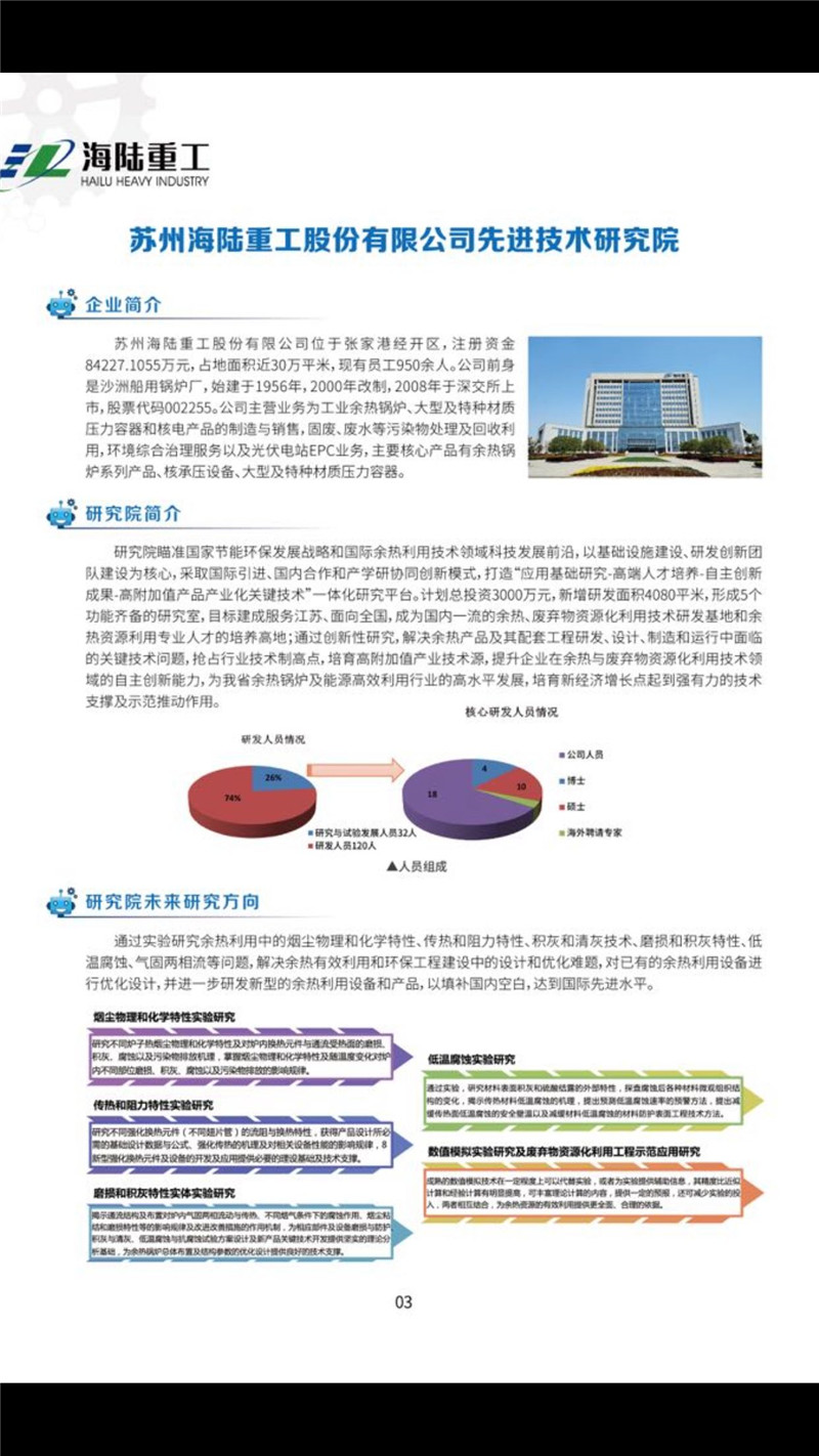 海陸重工一直秉承“科技領(lǐng)航,業(yè)界先鋒”的經(jīng)營(yíng)理念,專注于流程工藝中余熱、廢熱回收與環(huán)保技術(shù)相結(jié)合的技術(shù)研發(fā),主營(yíng)業(yè)務(wù)為主工業(yè)余熱鍋爐、大型及特種材質(zhì)壓力容器和核電產(chǎn)品的制造與銷售,固廢、廢水等污染物處理及回收利用,環(huán)境綜合治理服務(wù)以及光伏電站EPC業(yè)務(wù)。本公司先進(jìn)技術(shù)研究院瞄準(zhǔn)國(guó)家節(jié)能環(huán)保發(fā)展戰(zhàn)略和國(guó)際節(jié)能環(huán)保技術(shù)領(lǐng)域科技發(fā)展前沿,以基礎(chǔ)設(shè)施建設(shè)、研發(fā)創(chuàng)新團(tuán)隊(duì)建設(shè)為核心,采取國(guó)際引進(jìn)、國(guó)內(nèi)合作和產(chǎn)學(xué)研協(xié)同創(chuàng)新模式,打造“應(yīng)用基礎(chǔ)研究-高端人才培養(yǎng)-自主創(chuàng)新成果-高附加值產(chǎn)品產(chǎn)業(yè)化關(guān)鍵技術(shù)”一體化研究平臺(tái)。