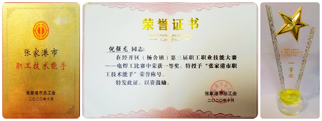 祝賀我公司倪強(qiáng)龍?jiān)诮?jīng)開(kāi)區(qū)(楊舍鎮(zhèn))第三屆職工技能大賽 電焊工比賽中榮獲一等獎(jiǎng),并被 授予“經(jīng)開(kāi)區(qū)(楊舍鎮(zhèn))技能 明星”榮譽(yù)稱號(hào)!